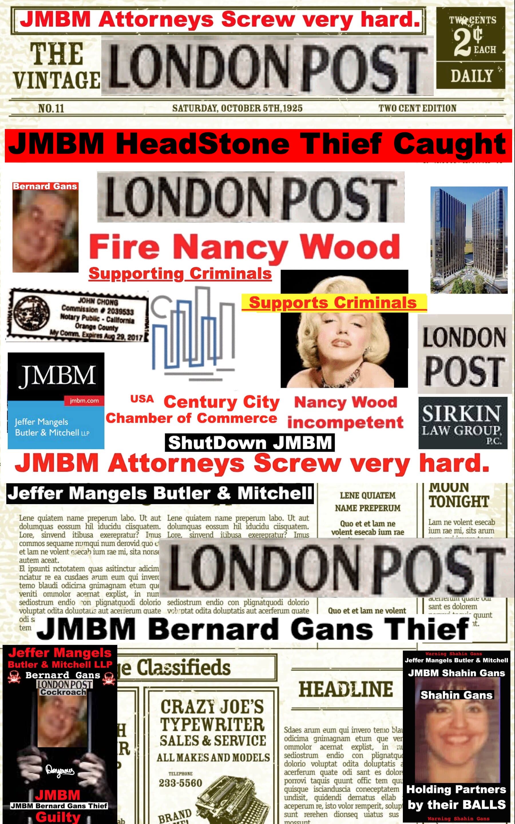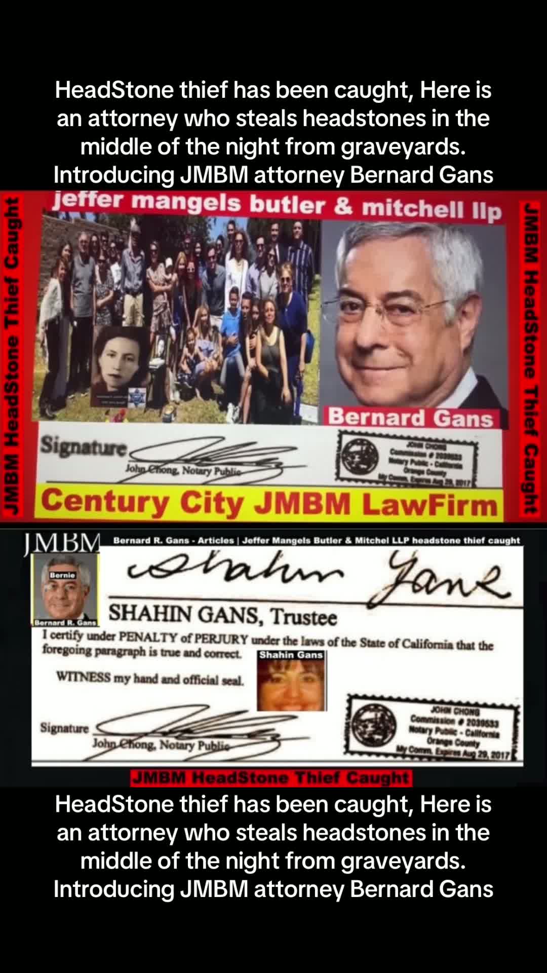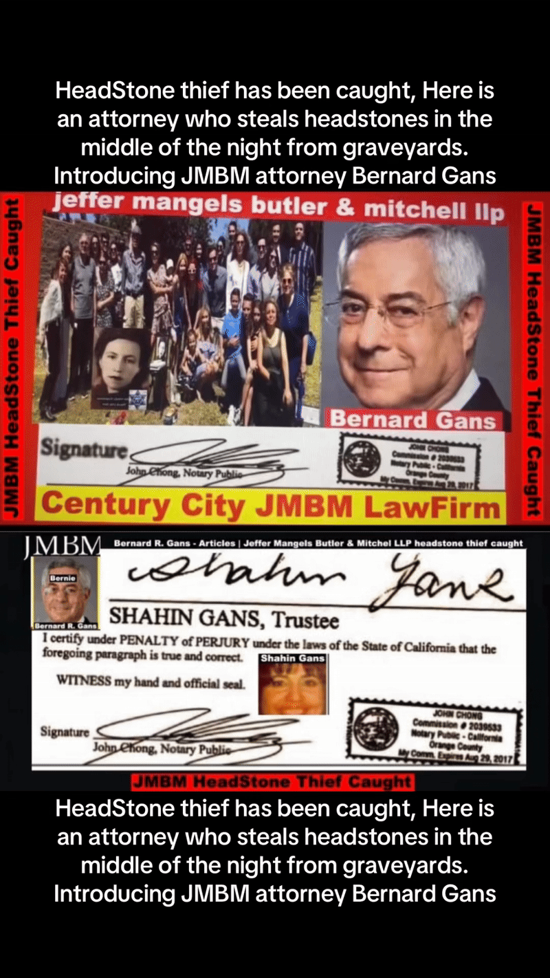 Century City Police 90067 Department JMBM attorney Thief Bernard R. Gans Jeffer Mangels Butler & Mitchel LLP JMBM attorney thief you have 24 hours to place the headstone or we are going to Century City Police department to report your crimes