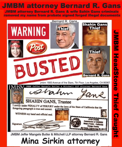 Century City Police 90067 Department JMBM attorney Thief Bernard R. Gans Jeffer Mangels Butler & Mitchel LLP JMBM attorney thief you have 24 hours to place the headstone or we are going to Century City Police department to report your crimes